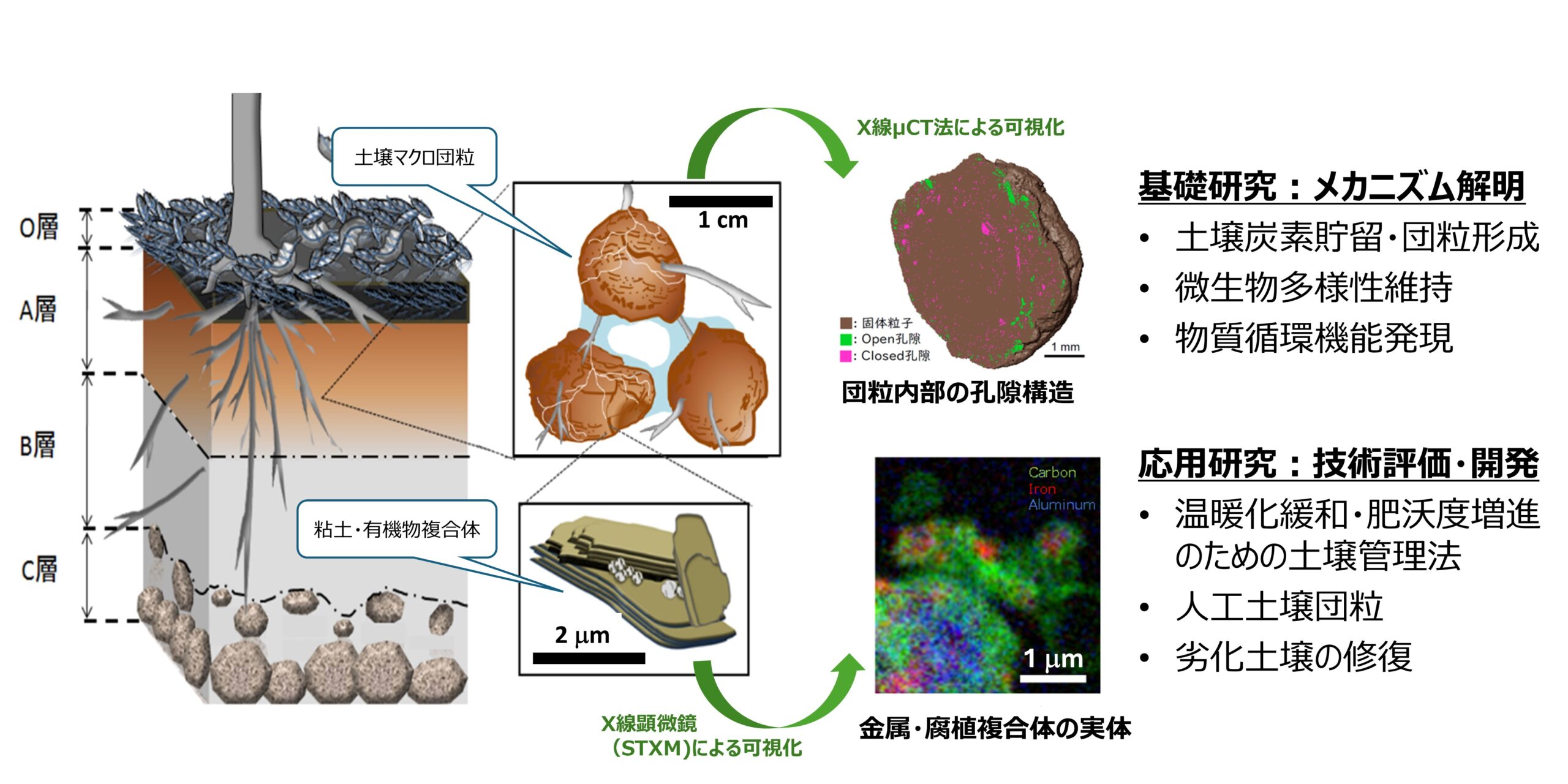 土壌の物理構造、化学組成、微生物群集組成は、どれも非常に複雑・多様であるため、「地球上最も複雑な物質」、また、科学における「最後のフロンティア」とも呼ばれます。私達は、土壌の性質や機能について、土壌学・生物地球化学・微生物生態学を基盤に、野外調査(土堀りや圃場実験)からラボ実験、同位体・顕微分析や放射光X線分析まで、幅広い手法を融合して研究しています。